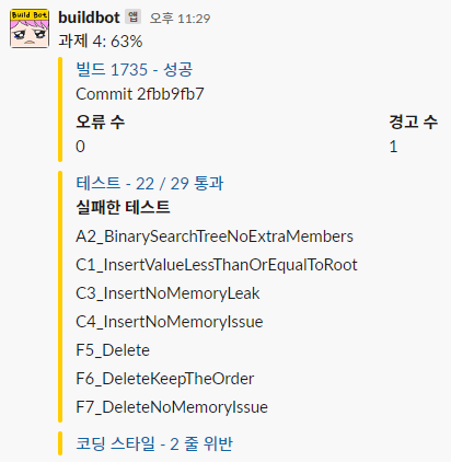 시간이 들어가는 만큼 배워가는 것도 정말 많았다! 실습 / 과제의 최대 장점은 내 코드에서의 문제점을 상세히 짚어준다는 점이다. 빌드봇은 테스트 케이스 외에도 내 코드에 메모리 관리가 잘 되어 있는지, POCU의 코딩표준 에 부합하는지, 강의를 제대로 이해했는지 꼼꼼히 확인한다. 이 중 하나라도 안 되어있으면 어김없이 빌드봇은 울상이 된다!
