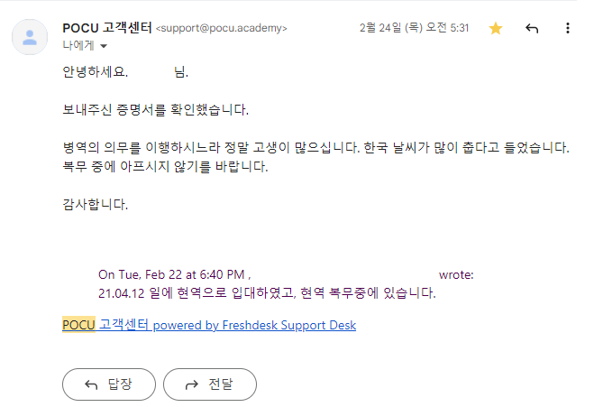 쉽지 않은 수강환경과, 쉽지 않았던 강의 내용이었지만 POCU의 배려, 운, 부대 사정 모두 잘 따라줘서 다행이었습니다. 수강할 시간이 있을까 싶은 환경 속에서 틈틈히 시간을 내어 공부한 덕분에 군생활 동안 전공자로써 꼭 알아야 할 C / C++의 중요한 내용을 제대로 배웠네요. 수강을 고민할 때 또는 수강 중에 포기했더라면 얻지 못할 값진 배움이었습니다. 있는 시간 없는 시간내어서, 배울 게 많았던 두 과목 모두 패스했다는 게 군생활 중 제일 잘한 점으로 꼽을 수 있습니다. 그래서 주변인들에게 POCU를 추천하곤 합니다.